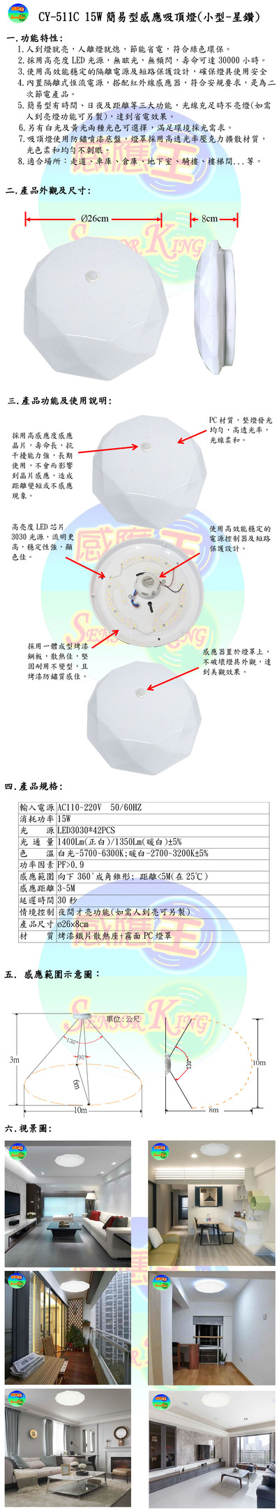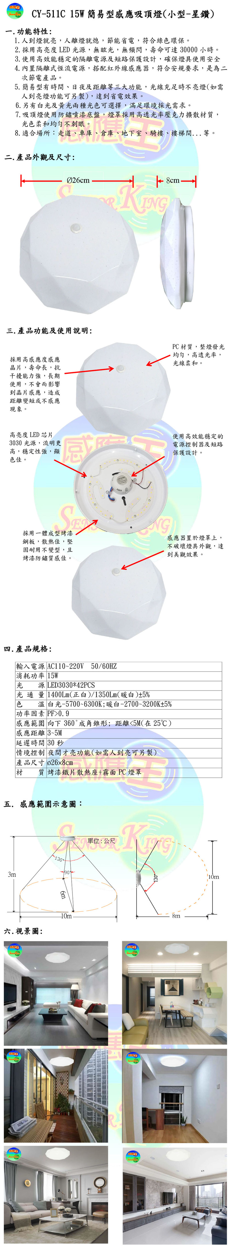 15W簡易型感應吸頂燈(小型-星鑽)